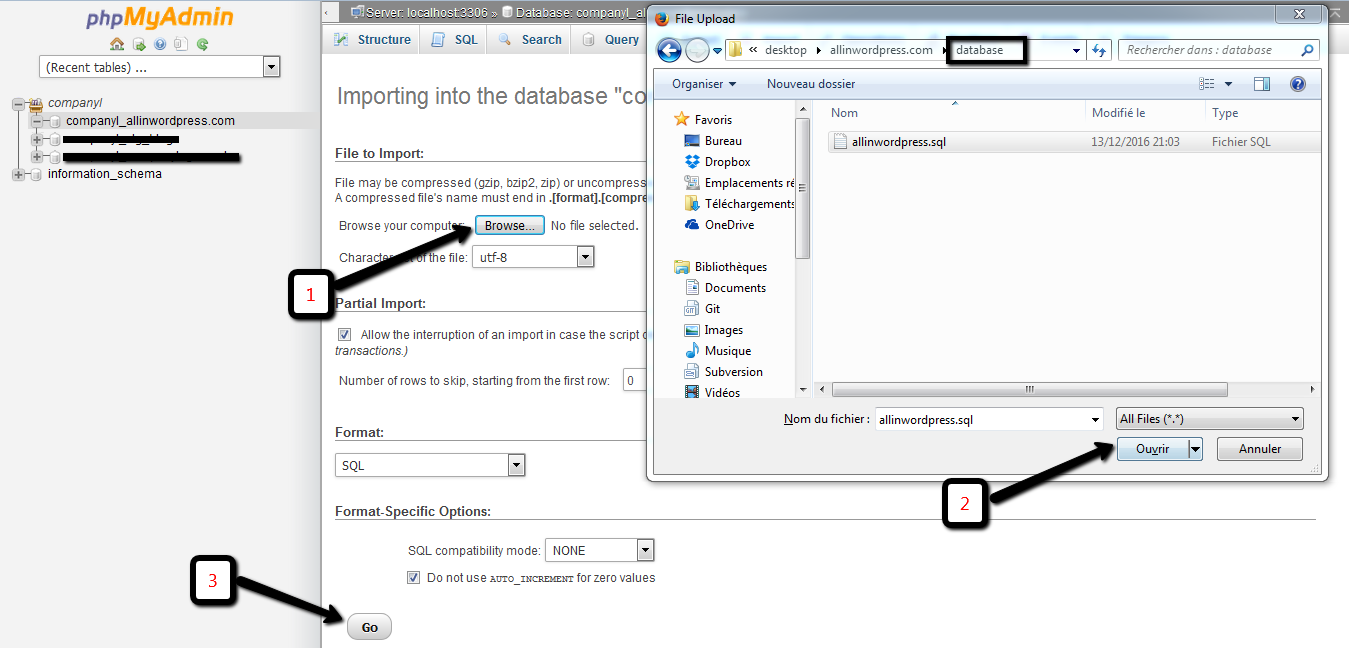 - 14. First select your database on the left panel, by clicking on it. Then click "import" and import the database. This is the .sql file in the folder called "database".